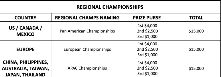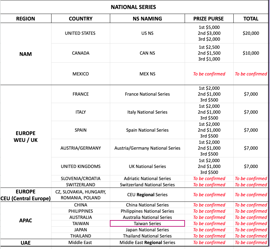 *Mexican National Series, Adriatic Series, Switzerland National Series, China National Series, Philippines National Series, Australia National Series, Taiwan Series, Japan National Series, Thailand National Series, Middle East Regional Series Prize Money coming soon.
